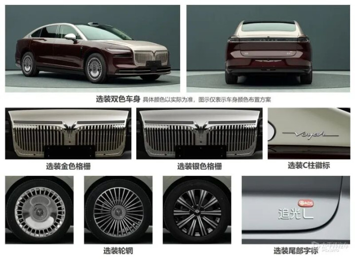 车身侧面更为流畅优雅,配备隐藏式门把手和多辐式轮毂,并提供20英寸“大饼式”轮毂选装,对应的轮胎规格为245/45 R20。此外,新车还提供双拼色车身选装,且可选装金色格栅或银色格栅,C柱也可选装独特徽标。
